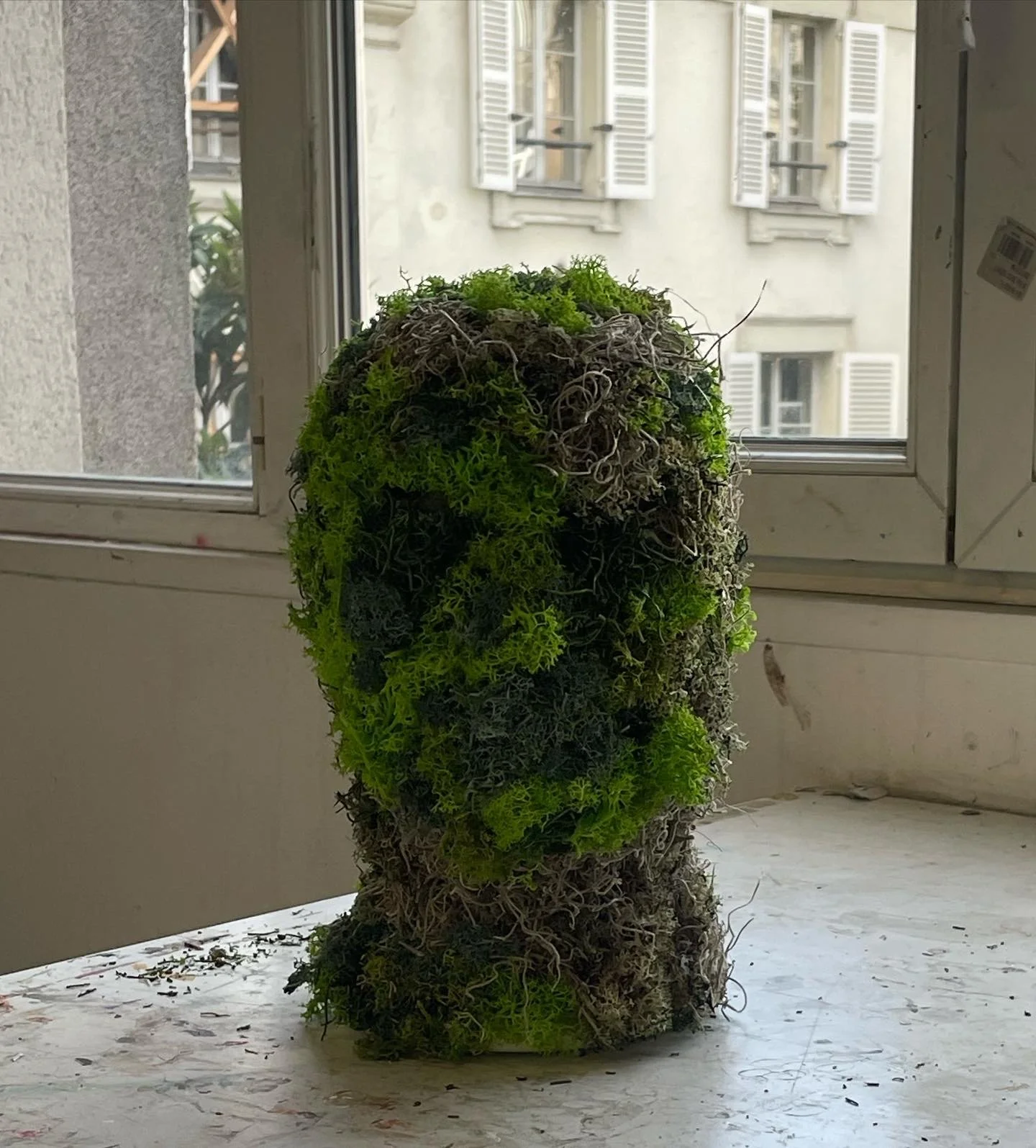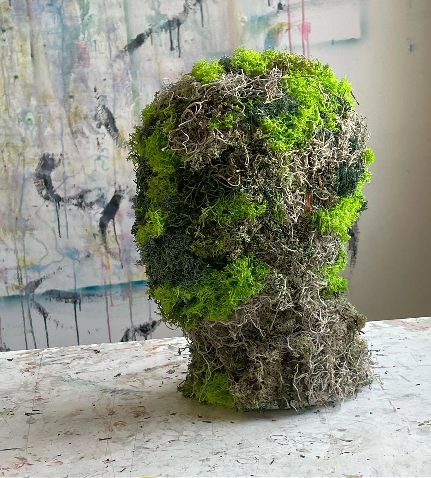 As the moss suffocates the surface, the sculpture illustrates how human actions slowly drain the planet’s vitality.